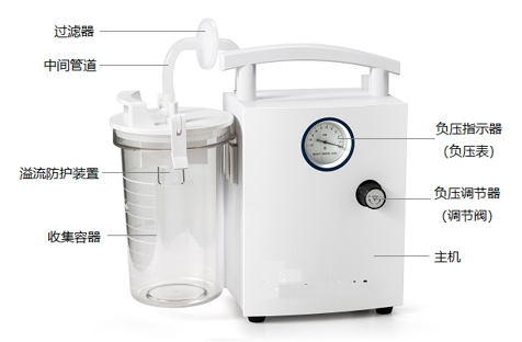 医用电动吸引器主要由负压源、负压指示器、空气过滤器、收集容器组件(收集容器和带吸引接头的密封盖)、防溢流装置(浮子阀或缓冲杯等)、负压调节装置、中间管道、吸引管道构成。